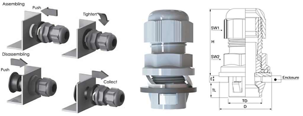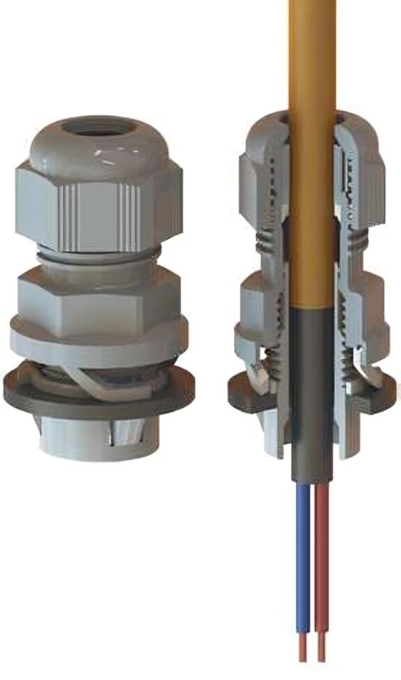 The SmartFit cable gland replaces traditional locknut-based designs with a revolutionary snap-in mechanism. Instead of reaching behind enclosures to secure locknuts, installers simply push the gland into place and insert the cable with no rear access required.