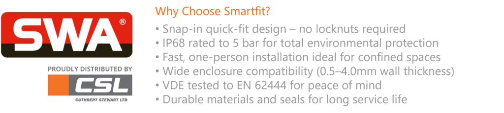 Tight spaces, restricted rear access and repetitive fitting tasks can slow projects down and introduce unnecessary complexity. The SmartFit Cable Gland has been designed to remove these pain points and deliver a faster, cleaner and more reliable approach to cable entry without compromising protection or compliance.